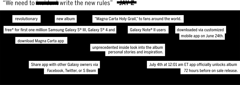 Yesterday saw Jay-Z make the surprise announcement of his new album “Magna Carta Holy Grail” during half time of game 5 of the NBA Finals between Miami Heat and the San Antonio Spurs. This was no ordinary announcement. It was made via a 3 minute advertisement featuring Hov in the studio with Rick Rubin, Swizz Beatz, Pharrell Williams and Timbaland, all working on the upcoming album. The release date of July 4th and the fact it was announced at the NBA Finals would usually be the big talking points of the news. However, the biggest surprise of the announcement is the fact that Jay-Z has struck a rather interesting deal with electronics giant Samsung.
