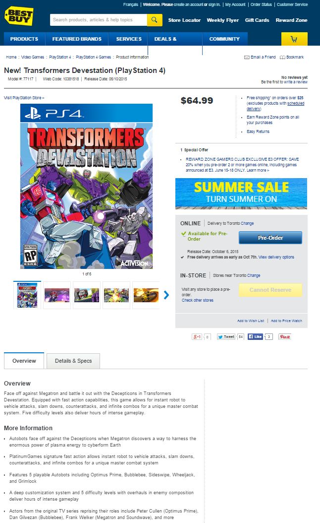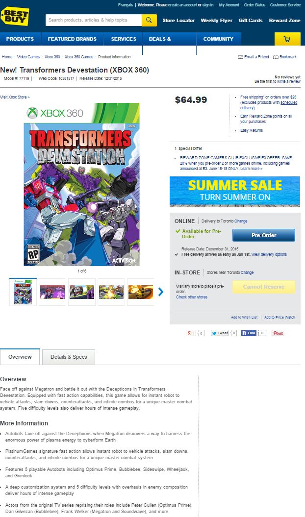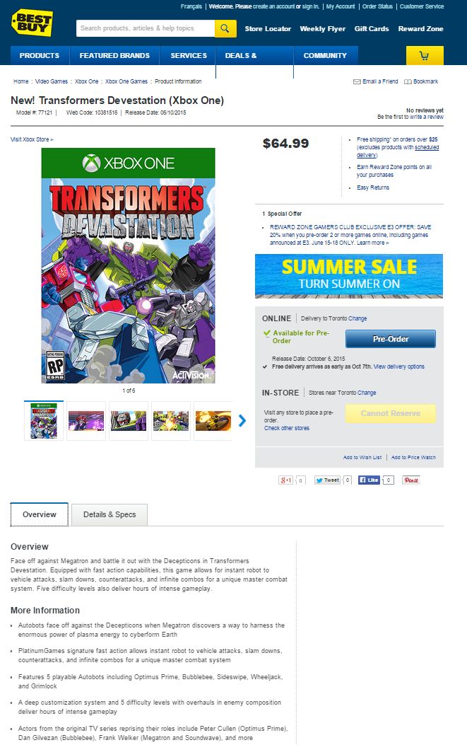 According to Best Buy Canada listing, gamers are getting Transformers: Devastation for PS4, Xbox One, PS3 and Xbox 360, a cel-shaded brawler which will be revealed at E3 2015.
